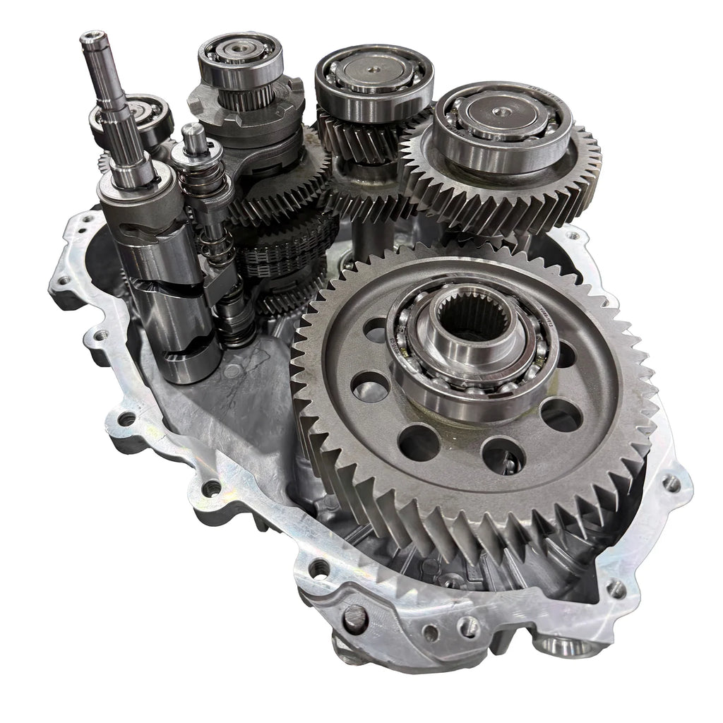 Mounting bolts and brackets are included. This transmission has an upgraded heavy duty double reverse chain and upgraded heavy duty pinion bearing retainer. This transmission comes with the stock gear reduction. Does not include turf mode.