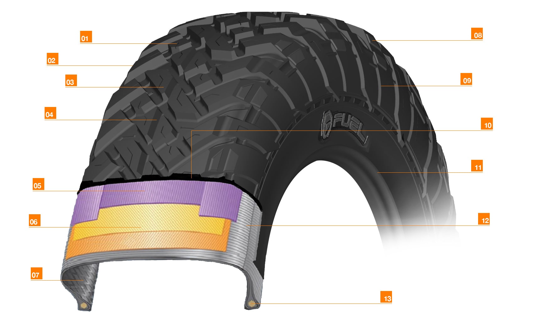 - 2-layer carcass design improves tires stability and durability, and continues to ensure high-strength impact resistance.