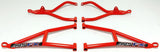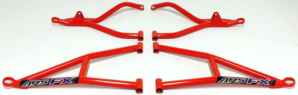 Durable Heavy Duty A-Arm Kit with Maximum Ground Clearance Design. Zbroz Racing Max Ground Clearance +2" Forward A-Arm kit allows the the mounting of 30"-32" tall tires without modification. Simply bolt on more ground clearance, durability and extends your wheel base by 2" forward. Exactly what you need for racing or serious trail adventures where a larger tire is king. This kit includes all four a arms to replace your stock weak A-Arms. Powder coated to your choice of color or left raw at your request. These arms are easily installed in your driveway or garage.