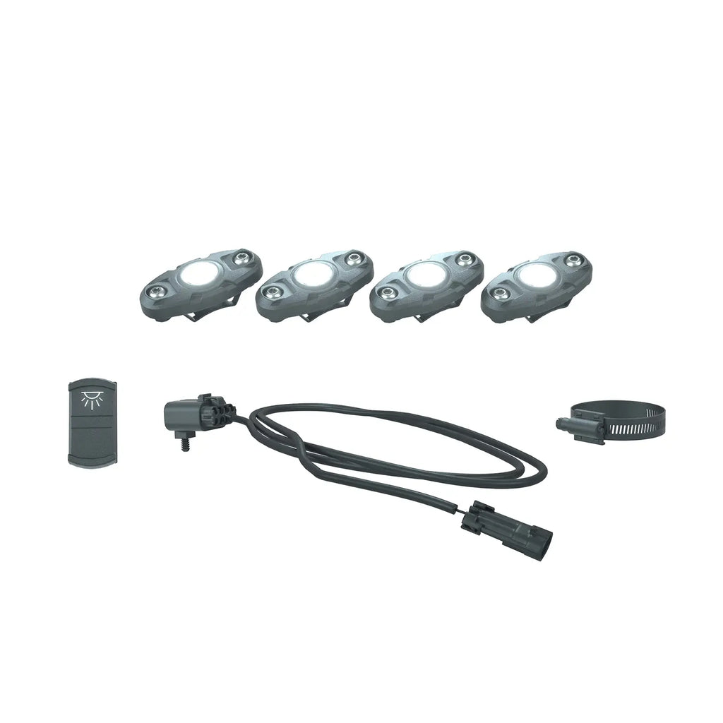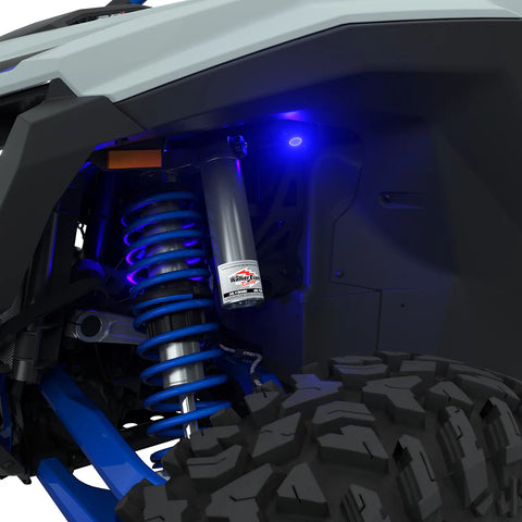 Pro Armor Rock Lights enhance visibility during off-road adventures. These rugged wheel well lights are designed to illuminate the ground around your vehicle, making it easier to navigate rocky terrain, trails or off-road paths, especially in low-light conditions. Universal mounting allows you to install them in the wheel wells or any other location you prefer. Constructed with premium materials, these rock lights are built to withstand the toughest off-road environments for durability and longevity. The rock light kit includes a set of four lights, along with all necessary mounting hardware and detailed installation instructions. This item has universal fitment for Polaris PULSE-equipped vehicles.