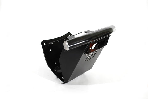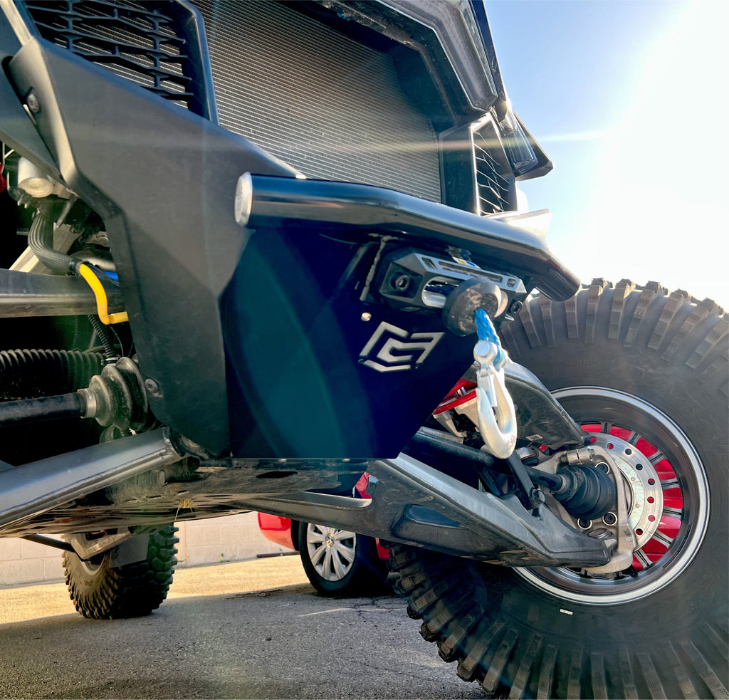 The tubing is constructed with 1.75” steel tubes and 3/16” steel plate for the winch mount. 1/8” steel plate reinforced for the fairlead mount! Everything is CNC cut and bent for precision & perfect fitment. The skid plate is made from 5052 aluminum to offer flexibility if it is hit with any objects on the trail. Also comes with our stylized 6061 billet tube caps for a bit of added flare.