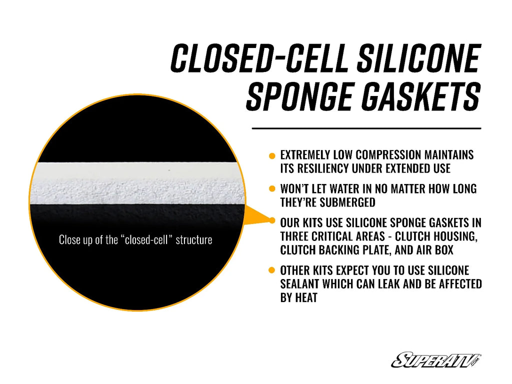 This kit comes with everything you need to dive deep without swamping your machine’s most vital components. You get heavy-duty risers that elevate your air intake and output and closed-cell silicone sponge gaskets to keep everything watertight. Each piece was designed with the exceptional level of expertise you’ve come to expect from SuperATV, so you can bury it in confidence.