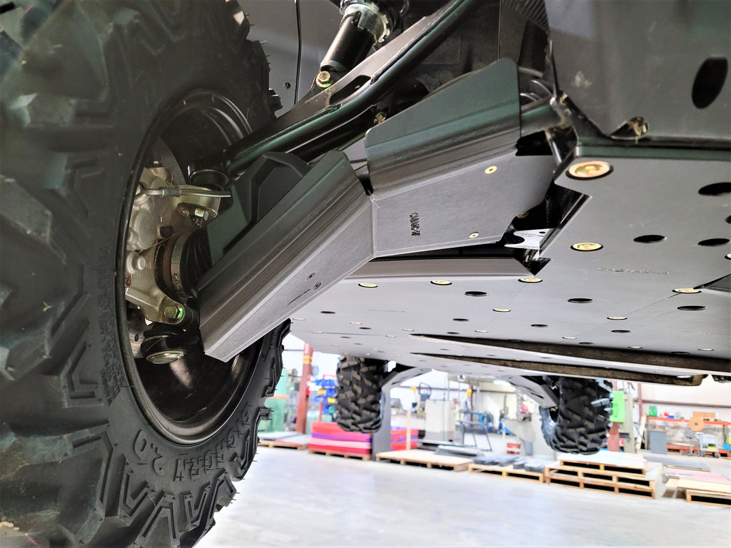 Break bad on the trail, ride the most buggy-busting terrain you can find - Trail Amor's a-arm guards for the Can Am Defender, Can Am Defender Max, Can Am Defender Pro can take the iMPACT! WILL FIT THE FACTORY ARCHED A-ARMS OF THE LISTED MODELS ONLY ON FITMENT GUIDE IN GALLERY. WILL NOT FIT STRAIGHT A-ARMS. CAN AM HAS TWO VERSIONS (TWO DIFFERENT PART NUMBERS) OF ARCHED A-ARMS. IF THE MACHINE IS NOT ON THIS LIST, THESE GUARDS WILL NOT FIT. AGAIN PLEASE SEE FITMENT GUIDE FOR SPECIFIC FITMENT! See TA011ARMIMP-CAD-XMR or TA011ARMIMP-CAD-XMR-22 for the other ARCHED A-ARM Fitment. IF YOUR VEHICLE IS NOT ON EITHER OF THESE LIST, WE HAVE NOT VERIFIED FITMENT. Made of the same 1/2" supertough polymer, we make our skid plates out of, these are by far the toughest, best designed and coolest a-arms on the market. Guards have three sided protection of your front and rear CV boots - front, rear and bottom - and mount easily with no drilling required. All mounting hardware and simple photo-documented installation instructions are included. These front A-arm guards are not large enough to engrave upon and so have a Trail Armor logo sticker. Picture of tri-colored guards below are to show what the colored edges will look like. Colors are considered a special order and are non-returnable.