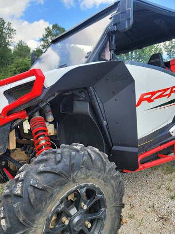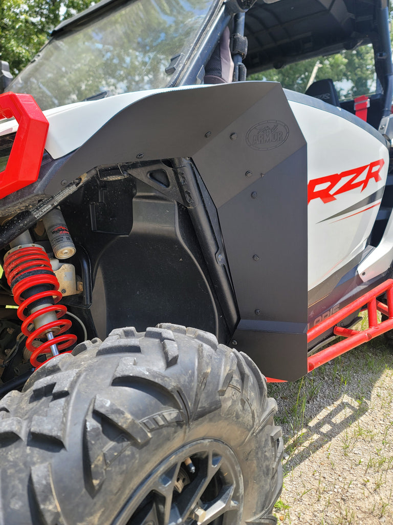 Made of HDPE plastic (textured on face side) custom cut to work with the RZR XP 1000 and RZR XP 4 1000. Fender flare extends an average of 4" past the factory fender (in some places its wider, some places narrower).
