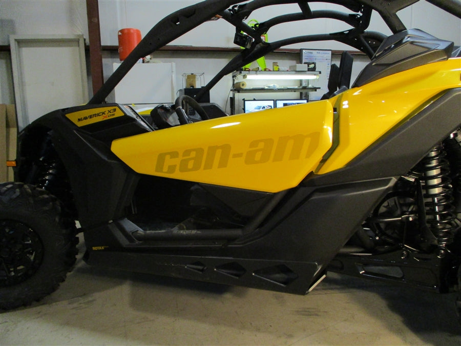 Get the best in under vehicle protection with Trail Armor's full skid plate set for the Can Am Maverick X3 Turbo, X3 X DS Turbo R, X3 X RS Turbo R, X3 X MR Turbo, X3 X RC Turbo, X3 DS Turbo RR, X3 X DS Turbo RR, X3 X MR Turbo RR, X3 X RS Turbo RR, X3 X RC Turbo RR, X3 X RS Turbo RR Smart Shox, X3 X DS Turbo RR Smart Shox,X3 DS Turbo, X3 X RC Turbo RR, X3 X MR Turbo RR, X3 RS Turbo RR. PLEASE SEE ALSO FITS CHART IN GALLERY FOR SPECIFIC YEAR AND MODEL FITMENT. Made from Super Tough polymer, these 1/2" plastic skids are lighter than most traditional metal/aluminum skid plates and because they have no "impact memory", they absorb shocks to the bottom of your vehicle without the dents, galling and corrosion of metal/aluminum skids. Because our skid plates are made from the 1/2" material with unmatched impact strength, there is no need for any extra add ons to provide all you need to protect to the open areas of your X3. Trail Armor was the first in the industry to design skids with the formed leading edges (front and rear) featured on our skid plates. These leading edges protect vulnerable frame edges and wheel wells from blunt edge impacts and act as a starting edge to slide over obstacles without the resistance and drag of metal skid plates. Additionally,Trail Armor skids are designed with extended side panels bent to serve as slider nerfs which protect the vulnerable sides and rocker panels of your vehicle. Compare Trail Armor's skid set coverage with other skid manufacturer's like items - slider nerfs are either sold separately or the bottom skid coverage ends before the rocker panel, leaving this part of your vehicle unprotected. Trail Armor's skid plates come in easy to install panels that cover the full length and breadth of the vehicle, including the front and rear differential. Trail Armor skids for the X3 are formed to extend out and around the vulnerable belt housing while still allowing easy access for belt maintenance without removing the skids. Trail Armor's signature lap jointed panels create a continuous single smooth sliding surface - not stacked like other manufacturers skids with hard edges to create a catch point. Access holes to service points and oil drains make maintenance a breeze. Strategically placed drain holes allow dirt and debris to wash out - you don't have to remove them to clean out the belly your vehicle. However, if needed, individual panels may be removed to access different areas without removing the entire skid plate. Recessed mounting holes protect fasteners from damaging blows and keeping all bolt heads from protruding the skid's surface. All kits come with corrosion resistant hardware and photo-documented installation instructions. Installation videos, if available, are provided as a YouTube video on our site. Standard sliders roll up the sides as shown in the product picture. They act as a nerf bar protecting the sides of the rocker panels. Trimmed sliders extend past the bottom of the rocker panels about an inch but do not turn up the side. You can use OEM tubular nerf bars with trimmed sliders. COLORS ARE CONSIDERED A SPECIAL ORDER. THEY CANNOT BE CANCELLED OR RETURNED ONCE ORDERED. IF YOU HAVE ANY QUESTIONS ABOUT COLORS AND YOUR GRAPHICS, PLEASE CONTACT US.