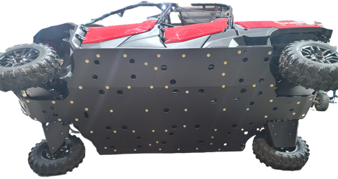 Get the best in under vehicle protection with Trail Armor's full skid plate set for the 2023 - 2024 Honda Pioneer 1000-6 Crew. Made from super tough polymer, these 1/2" plastic skids are lighter than most traditional metal/aluminum skid plates and because they have no "impact memory", they absorb shocks to the bottom of your vehicle without the dents, galling and corrosion of metal/aluminum skids. Additionally, these Trail Armor skids for the 1000-6 Crew are designed with extended side panels (extend past the rocker panel bottoms about 1/2") that serve as slider nerfs to help protect the vulnerable rocker panels of your vehicle. Compare Trail Armor's skid set coverage with other skid manufacturer's like items - slider nerfs are either sold separately or the bottom skid coverage ends before the rocker panel, leaving this part of your vehicle unprotected. Trail Armor's skid plates come in easy to install panels that cover the full length and breadth of the vehicle, including the front and rear differential. Access holes to service points and oil drains make maintenance a breeze. Strategically placed drain holes allow dirt and debris to wash out - you don't have to remove them to clean out the belly your vehicle. However, if needed, individual panels may be removed to access different areas without removing the entire skid plate. Recessed mounting holes protect fasteners from damaging blows and keeping all bolt heads from protruding the skid's surface. All kits come with corrosion resistant hardware and photo-documented installation instructions. Installation videos, if available, are provided as a YouTube video on our site. Note: Any Trail Armor a-arm guards shown installed on vehicle in pictures are sold separately and are not included as part of this skid plate set. See Part number TA011ARMIMP-HP1000-22. Colors are considered a special order and are not returnable. Tri Color sliders shown in gallery are for example only to show color contrasts. See Also Fits Chart in gallery for specific year and model fitment.