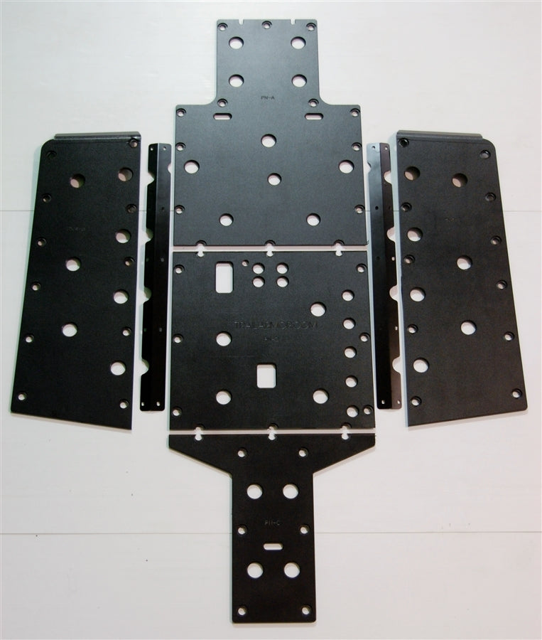Trail Armor's full skid plate set for the Honda Pioneer 700-4. Made from 1/2" supertough polymer, these plastic skids absorb shock to the bottom of the vehicle with no dents or rust and are lighter than traditional metal skids. Strategically placed drain holes allow dirt and debris to wash out - you don't have to remove them to clean out the belly your vehicle. This skid set also features a convenient oil drain access panel and access to the oil filter. Skids come in easy to install jointed sections that cover the full length and breadth of the vehicle, including the front and rear differential. Integrated side skids help protect outer floor board and rocker panel edges. Mounting hardware and instructions included. A-arm guards shown in picture are sold separately, see product TA011ARMIMP-HP700. Fits years 2014 - 2024.