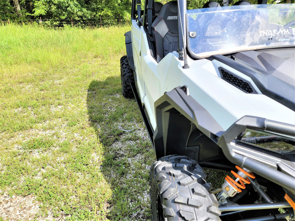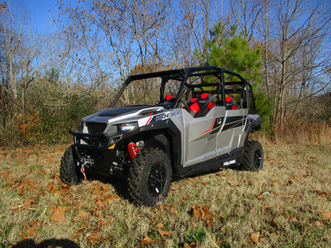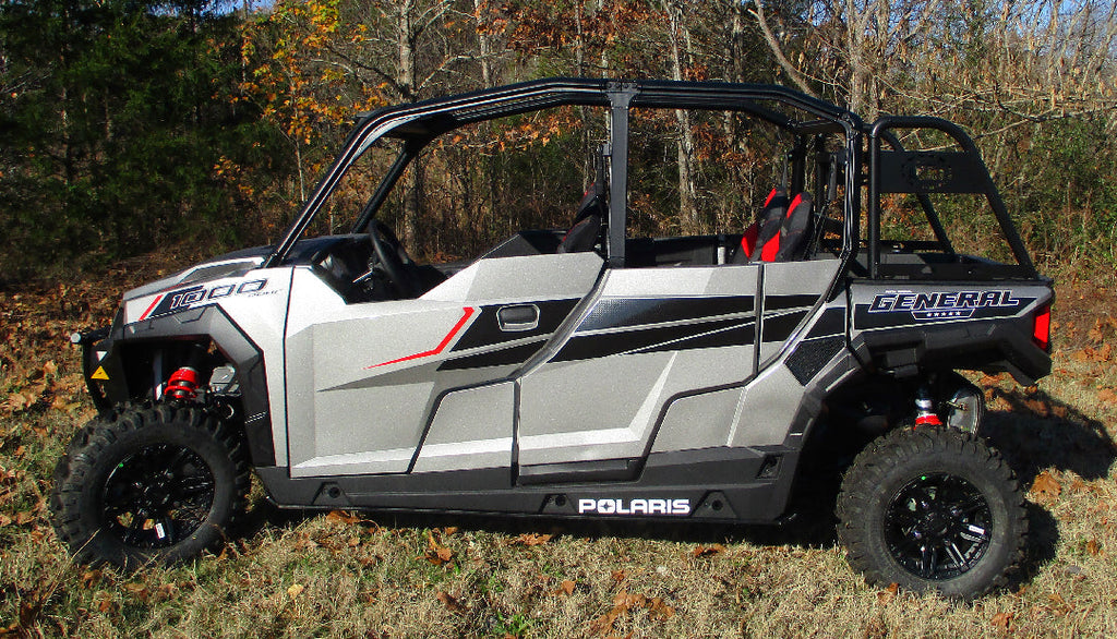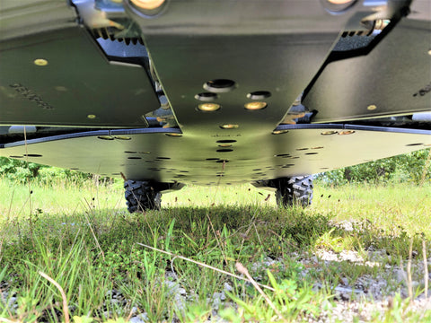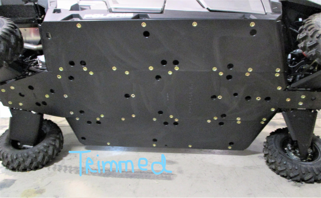 Get the best in under vehicle protection with Trail Armor's full skid plate set for the 2017 - 2025 Polaris General 4 1000 and General XP 4 1000 (all editions). Available in TRIMMED and STANDARD Sliders. Made from Super Tough polymer, these 1/2" plastic skids are lighter than most traditional metal/aluminum skid plates (see specs below) and because they have no "impact memory", they absorb shocks to the bottom of your vehicle without the dents, galling and corrosion of metal/aluminum skids. Trail Armor was the first in the industry to design skids with the formed leading edges (front and rear) featured on our skid plates. These leading edges protect vulnerable frame edges and wheel wells from blunt edge impacts and act as a starting edge to slide over obstacles without the resistance and drag of metal skid plates. Compare Trail Armor's skid set coverage with other skid manufacturer's like items - their slider nerfs are either sold separately or the bottom skid coverage ends before the rocker panel, leaving this part of your vehicle unprotected. Some competitors skids do not even cover the front differential area at all! Trail Armor's trimmed sliders include side panels which extend approximately 1/2" past the bottom of the rocker panel giving you complete under body protection without the additional cost. The standard sliders roll up the side of the vehicle to act as a nerf bar, protecting the side rocker panels as well as the bottom. Skid plates come in easy to install panels that cover the full length and breadth of the vehicle, including the front and rear differential. Another industry first, Trail Armor's lap jointed panels create a continuous single smooth sliding surface - not stacked like other manufacturers skids with hard edges to create a catch point. Access holes to service points and oil drains make maintenance a breeze. Strategically placed drain holes allow dirt and debris to wash out - you don't have to remove them to clean out the belly your vehicle. However, if needed, individual panels may be removed to access different areas without removing the entire skid plate. Recessed mounting holes protect fasteners from damaging blows and keeping all bolt heads from protruding the skid's surface. All kits come with corrosion resistant hardware and photo-documented installation instructions. Installation videos, if available, are provided as a YouTube video on our site. Please see ALSO FITS chart in gallery for specific year and model fitment. Colors are considered a special order. They cant be cancelled once ordered and are non-returnable. Sliders are not engraved. Picture shown for illustration of the tri-color edges. If you have any questions about a color and your graphics package, please contact us.