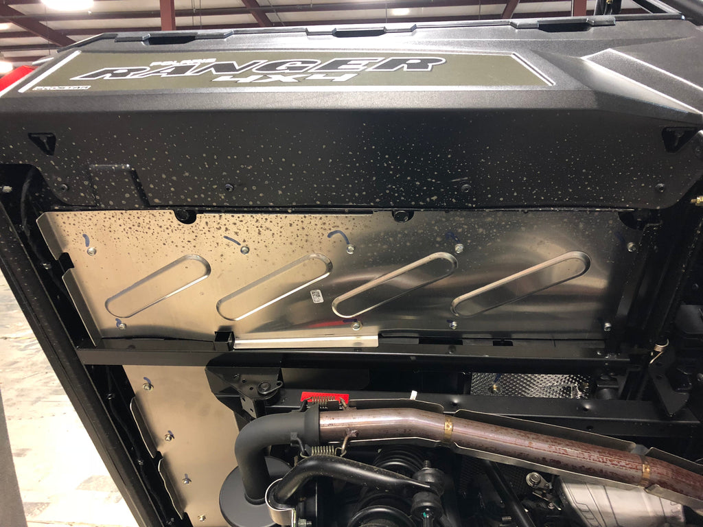 Tired of your tires caking mud in that impossible-to-clean honeycomb under your 2016 - 2021 Polaris Ranger Full Size Economy (has struts) 570 and 2017 - 2021 Ranger 570 Fullsize Economy Crew's dump bed and rear fender panels? Trail Armor's under bed mud shields with fender enclosures fit over those problem areas on the underside of your bed and in front of your tires to keep the mud out. Made from 1/8" thick plastic, these panels are custom cut to fit and will not interfere with dumping capability. Heat Shield is a Polaris item and should be installed on your vehicle. Not included in kit. Must specify year as there is a year break between 2016 and 2017.