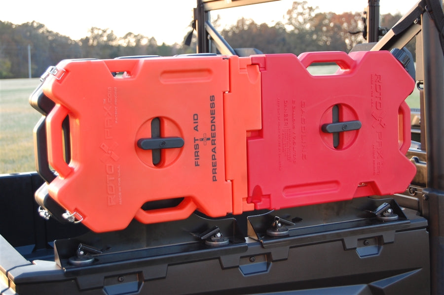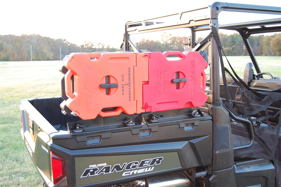 Trail Armor's mount for the Ranger and General is the only true all-in-one kit you need. These mounts can be used in a variety of configurations and locations - 1.75 gallon packs, 3 gallon packs, 4 gallon packs, singles, doubles, with a rack, without a rack, on the bed side rails, on the bed front - the options are limitless. Kit comes with 1 Trail Armor mount, 2 camlocks, and 1 Standard Pack Mount.