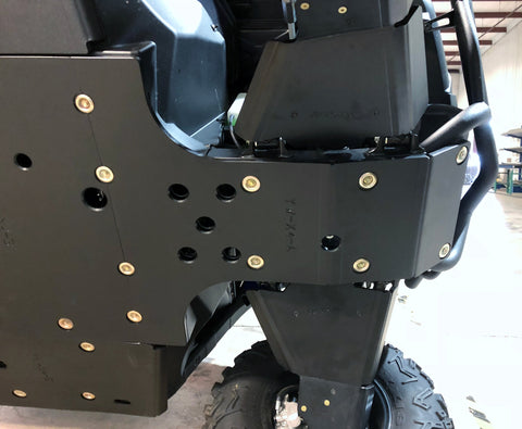 Get the best in under vehicle protection with Trail Armor's full skid plate set for the Yamaha Woverine 850 X4 (2018 - 2022), X4 850 Hunter, X4 850 Special Edition (2018 - 2020), X4 850 SE (2019), X4 850 XTR (2020 - 2024) and X4 850 R-Spec (2021 - 2024). Made from Super Tough polymer, these 1/2" plastic skids are lighter than most traditional metal/aluminum skid plates (see specs below) and because they have no "impact memory", they absorb shocks to the bottom of your vehicle without the dents, galling and corrosion of metal/aluminum skids. Trail Armor was the first in the industry to design skids with the formed leading edges (front and rear) featured on our skid plates. These leading edges protect vulnerable frame edges and wheel wells from blunt edge impacts and act as a starting edge to slide over obstacles without the resistance and drag of metal skid plates. Additionally, these skids for the Wolverine X4 are designed side panels that extend approximately a 1/2" past the rocker panels to protect the vulnerable sides and rocker panels of your vehicle. Compare Trail Armor's skid set coverage with other skid manufacturer's like items - slider nerfs are either sold separately or the bottom skid coverage ends before the rocker panel, leaving this part of your vehicle unprotected. Trail Armor's skid plates come in easy to install panels that cover the full length and breadth of the vehicle, including the front and rear differential. Access holes to service points and oil drains make maintenance a breeze. Strategically placed drain holes allow dirt and debris to wash out - you don't have to remove them to clean out the belly your vehicle. However, if needed, individual panels may be removed to access different areas without removing the entire skid plate. Recessed mounting holes protect fasteners from damaging blows and keeping all bolt heads from protruding the skid's surface. All kits come with corrosion resistant hardware and photo-documented installation instructions. Installation videos, if available, are provided as a YouTube video on our site. A-Arm guards if shown installed in pictures are not included and sold separately. Colors are considered a special order. They cannot be cancelled once ordered or returned. If you have any questions about colors and your graphics, please contact us and we'll give you our honest opinion. See Also Fits Chart in Gallery for specific year and model fitment.
