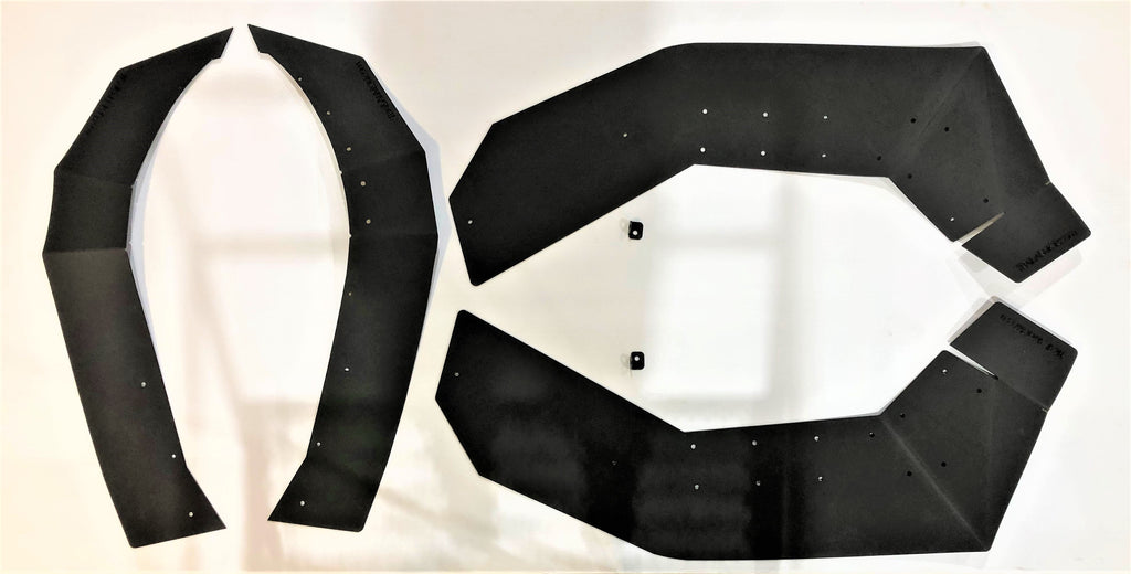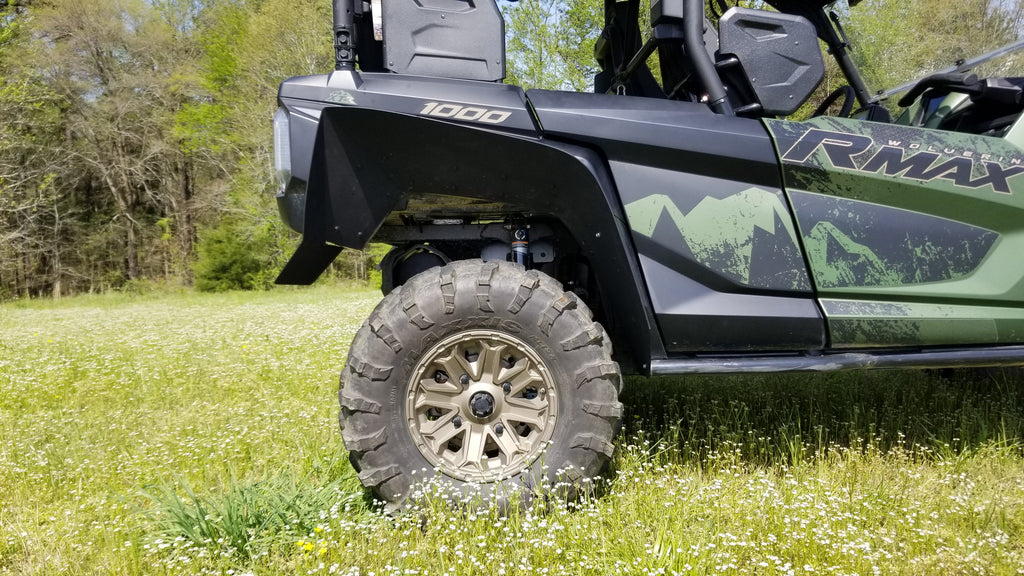 Made of HDPE plastic (textured on face side) custom cut to work with the front and rear Wolverine RMAX 4 1000 Compact fenders. Will extend the width of the vehicle 4 inches each side.
