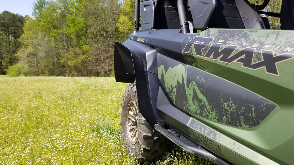 Extends the factory fender of the 2021 - 2024 Yamaha Wolverine RMAX 4 Compact to protect you from mud splash. Greater coverage in the rear than other mud flaps on the market. Will not fit the 2025 RMAX4 with a dump bed. See part number TAMFFE-YW-RMAX2.See also fits chart in gallery for specific year model fitments.